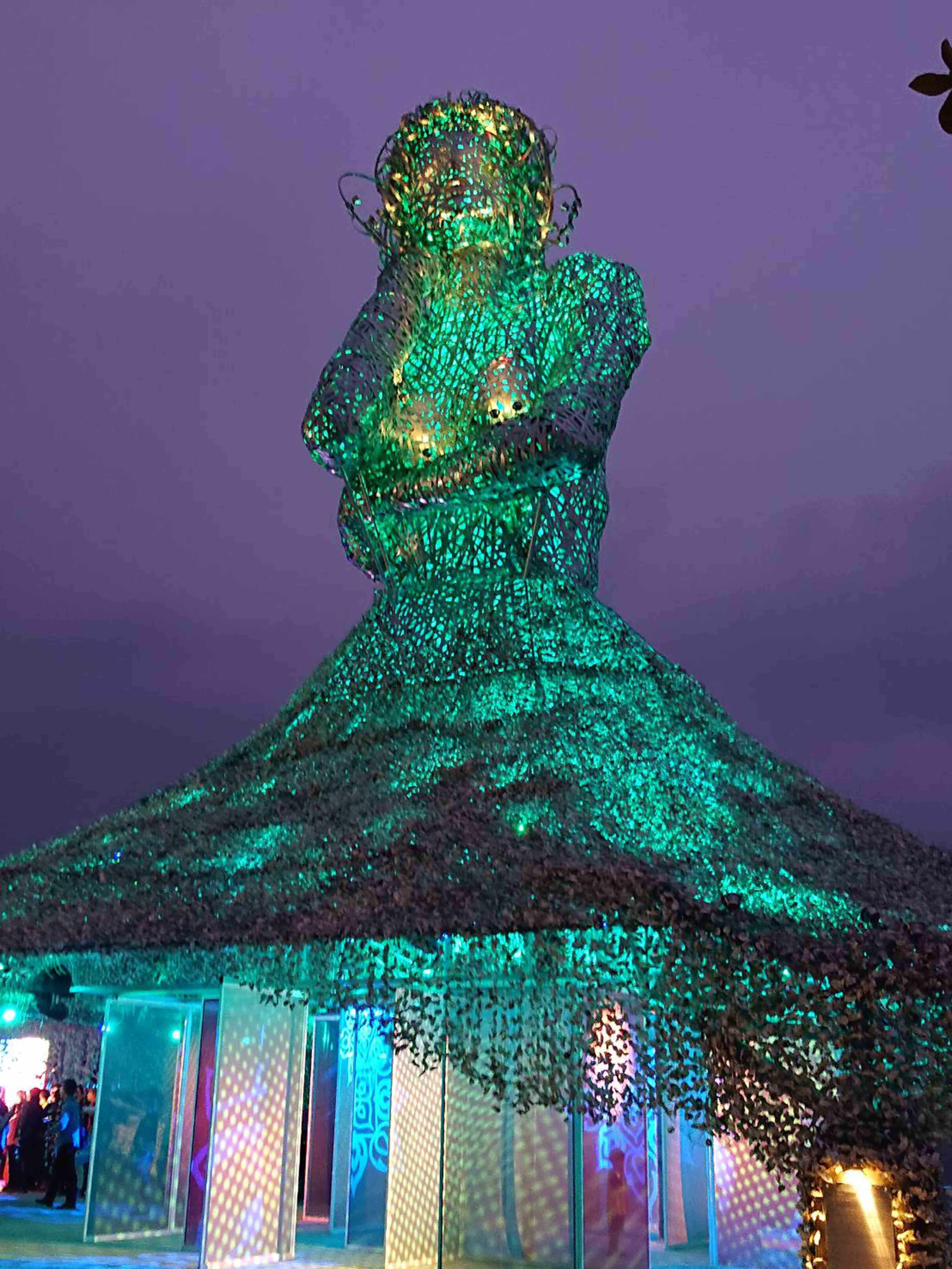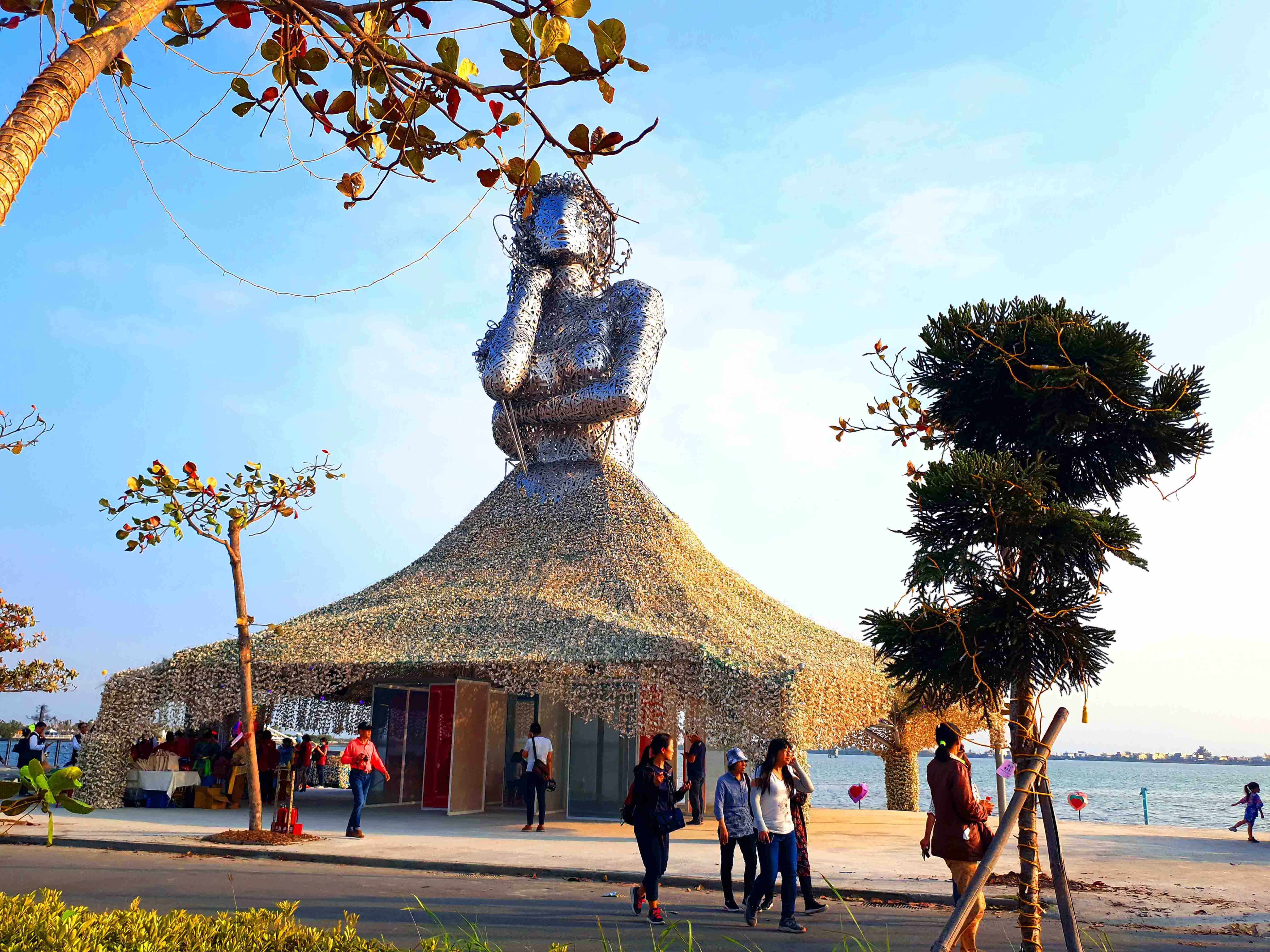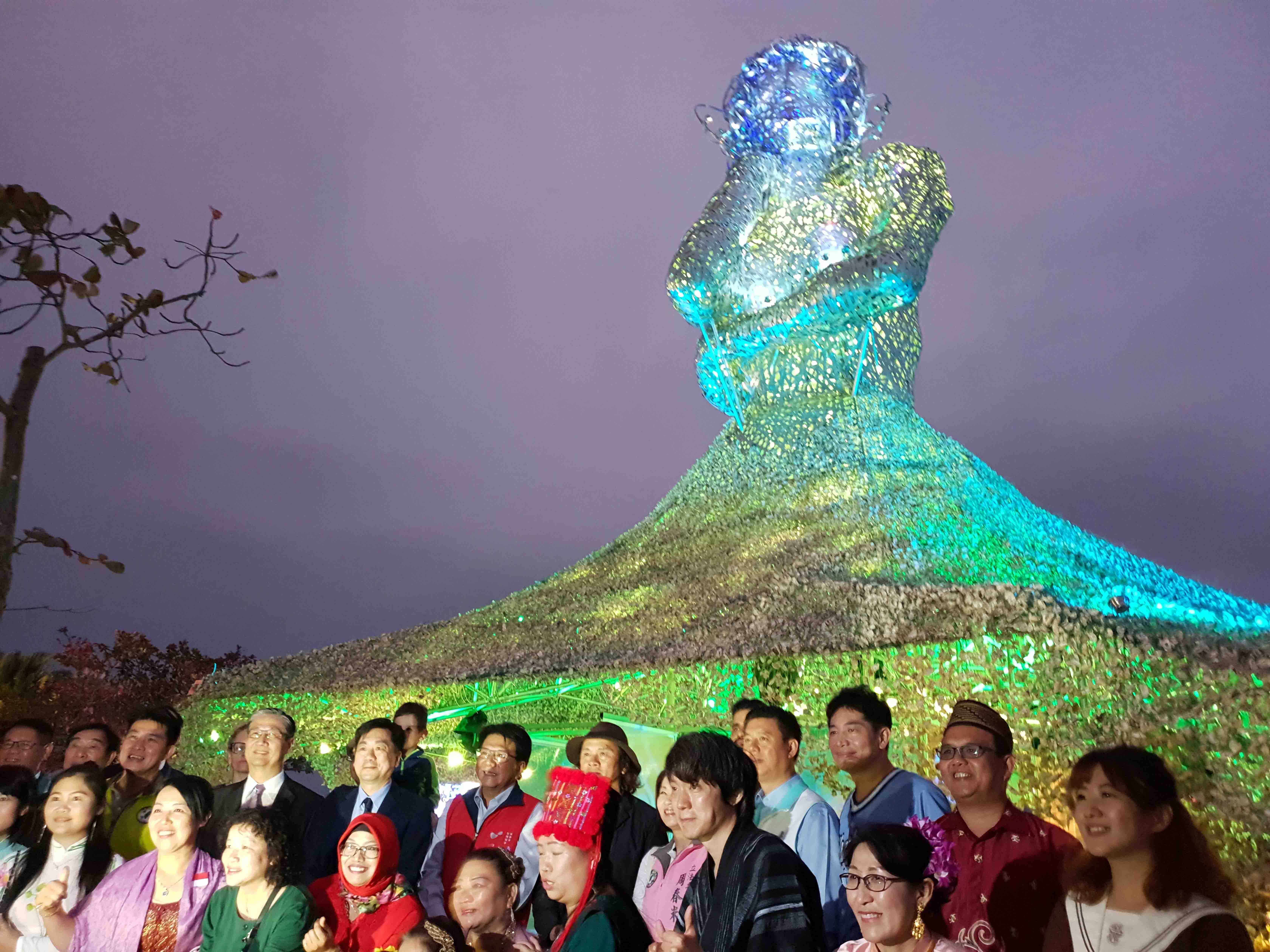 呼應昔日大鵬灣佈滿蚵棚的景象,採用大量蚵殼在地素材,並以鋼骨結構塑造出新住民特質,猶如海之女神般的嬌美、堅毅姿態。蚵殼如生命的綿延串連,多元文化之間交互編織。蚵殼串結的白色裙襬迎著海風輕飛,裙擺下文化展演激起多聲道的漣漪。白天感受到編織光影的灑落變化,夜間成為一座指引未來的光明燈塔。新住民女性來台落地生根,包容的力量讓她們融入環境。你容我融的生命故事,呈現在海之女神身上,強韌母性的慈悲大愛!