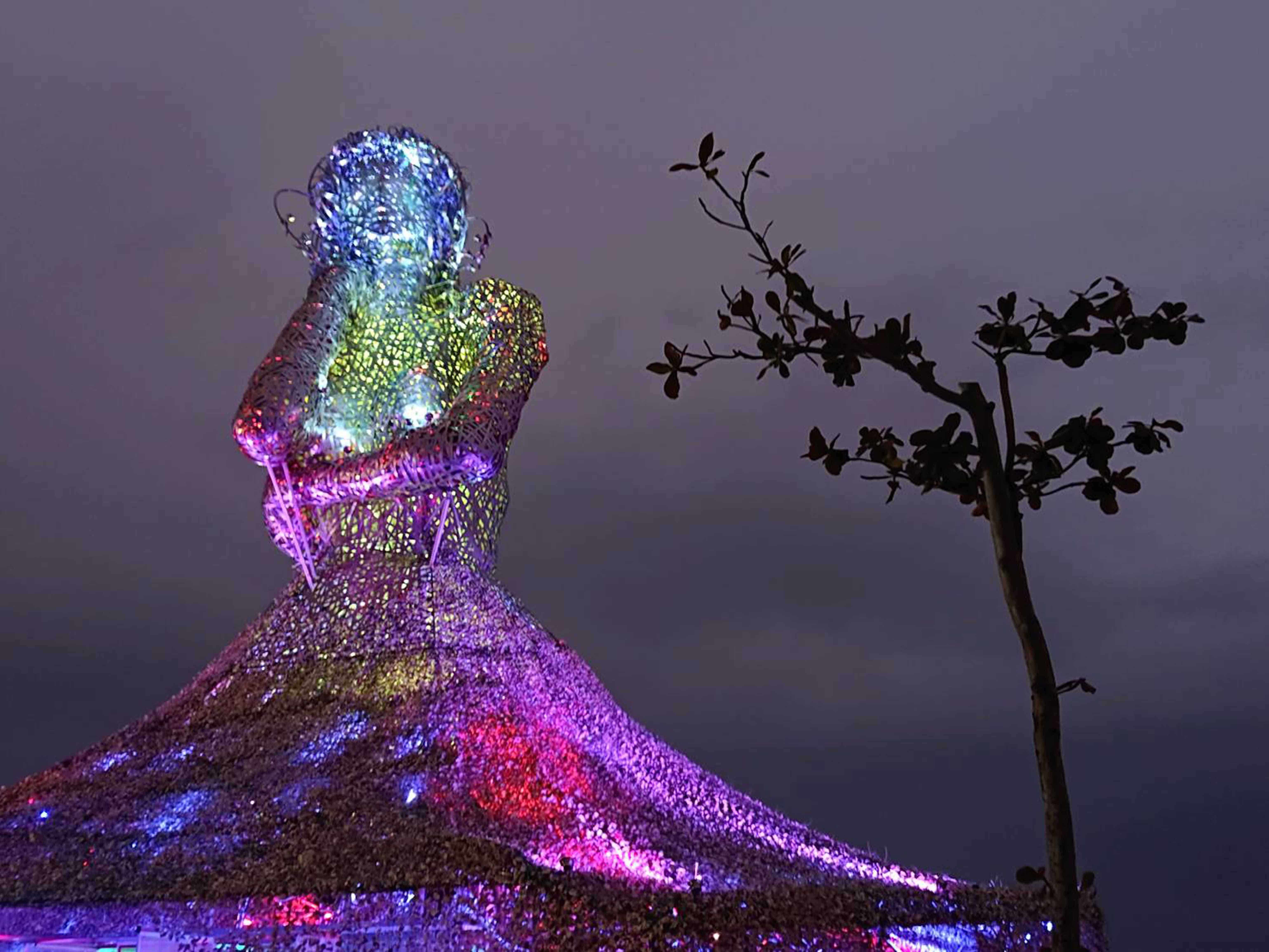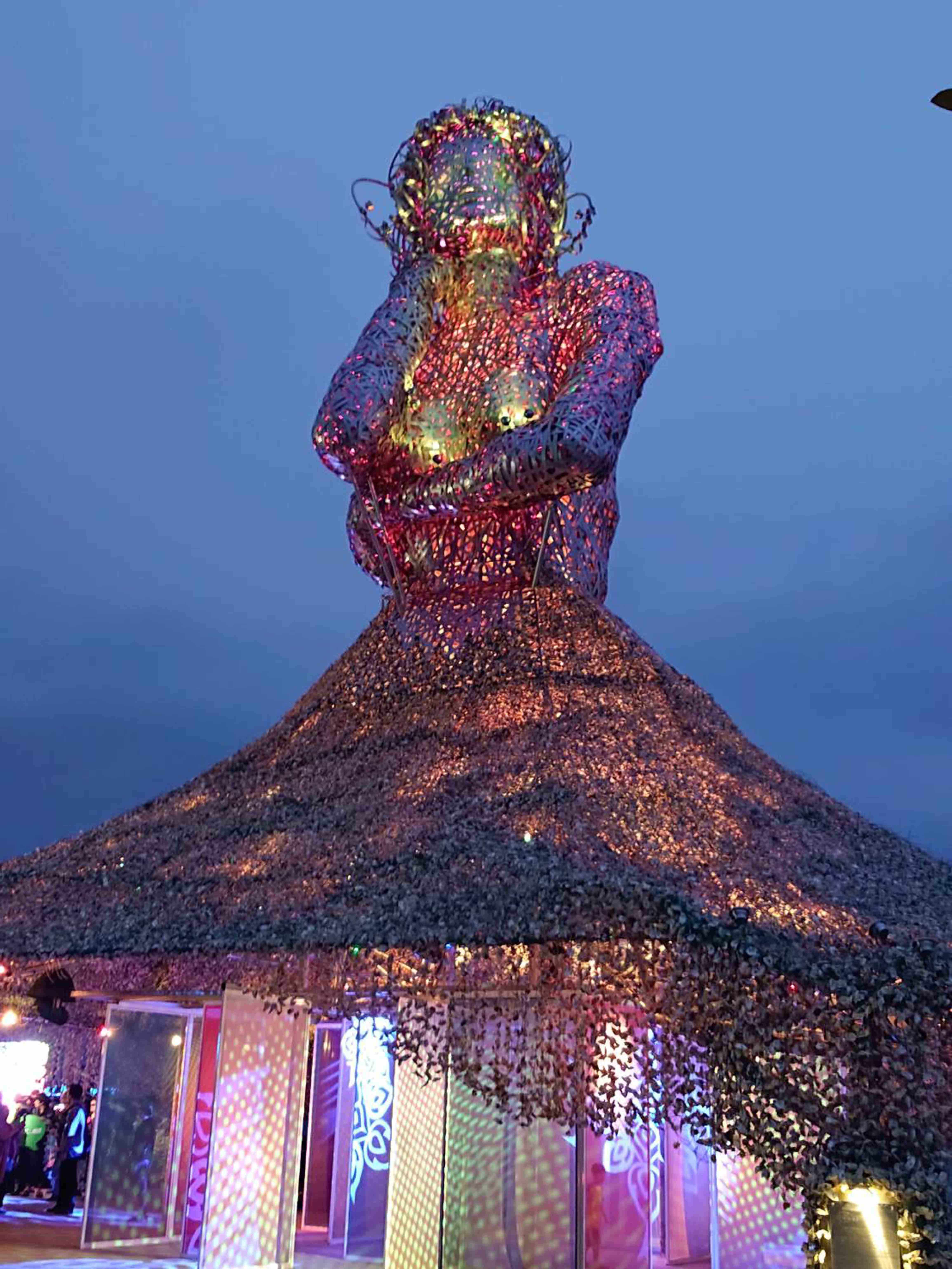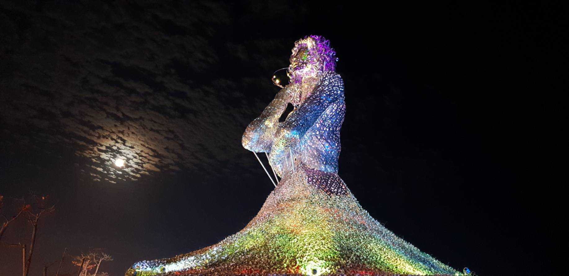 呼應昔日大鵬灣佈滿蚵棚的景象,採用大量蚵殼在地素材,並以鋼骨結構塑造出新住民特質,猶如海之女神般的嬌美、堅毅姿態。蚵殼如生命的綿延串連,多元文化之間交互編織。蚵殼串結的白色裙襬迎著海風輕飛,裙擺下文化展演激起多聲道的漣漪。白天感受到編織光影的灑落變化,夜間成為一座指引未來的光明燈塔。新住民女性來台落地生根,包容的力量讓她們融入環境。你容我融的生命故事,呈現在海之女神身上,強韌母性的慈悲大愛!