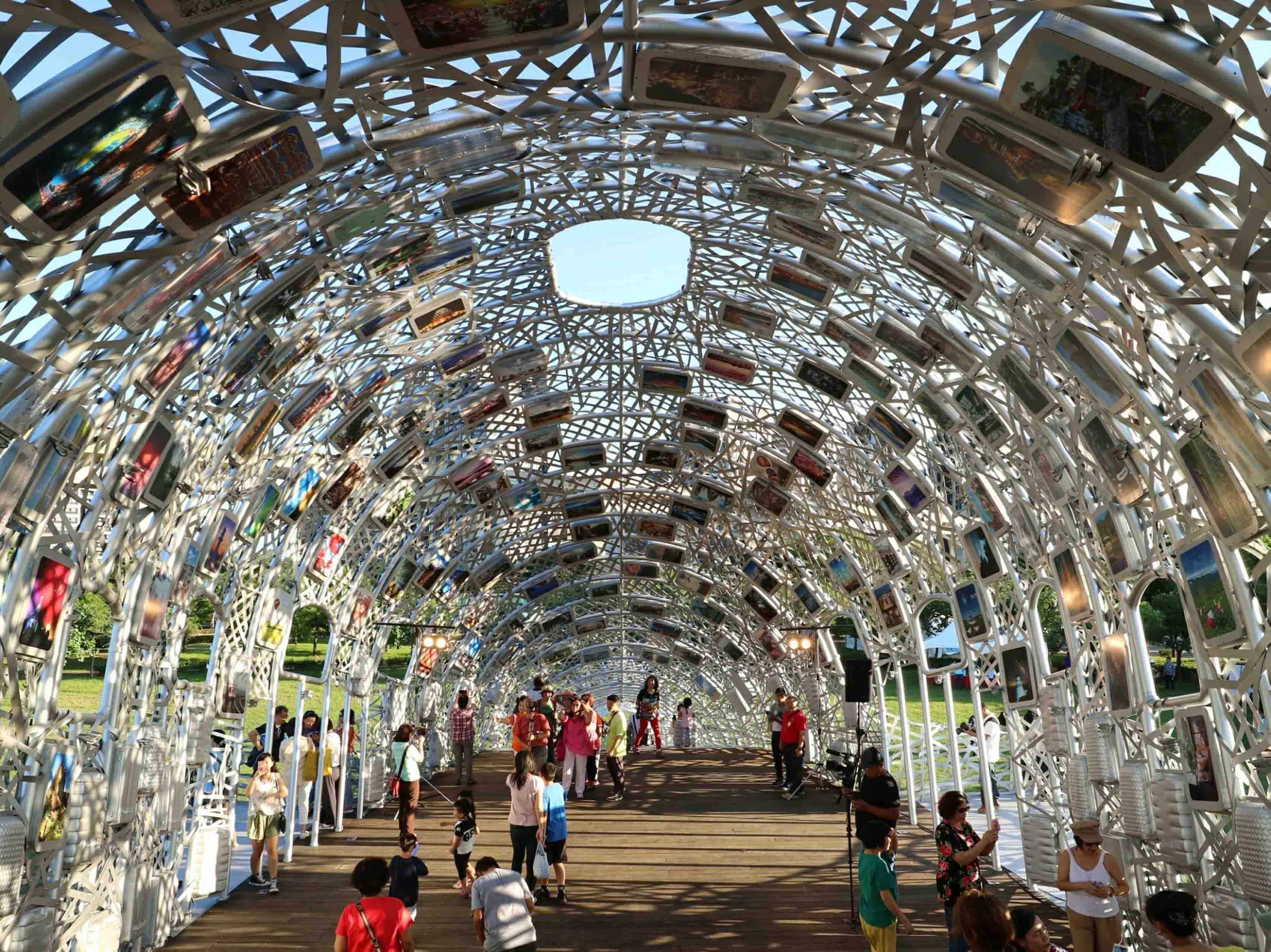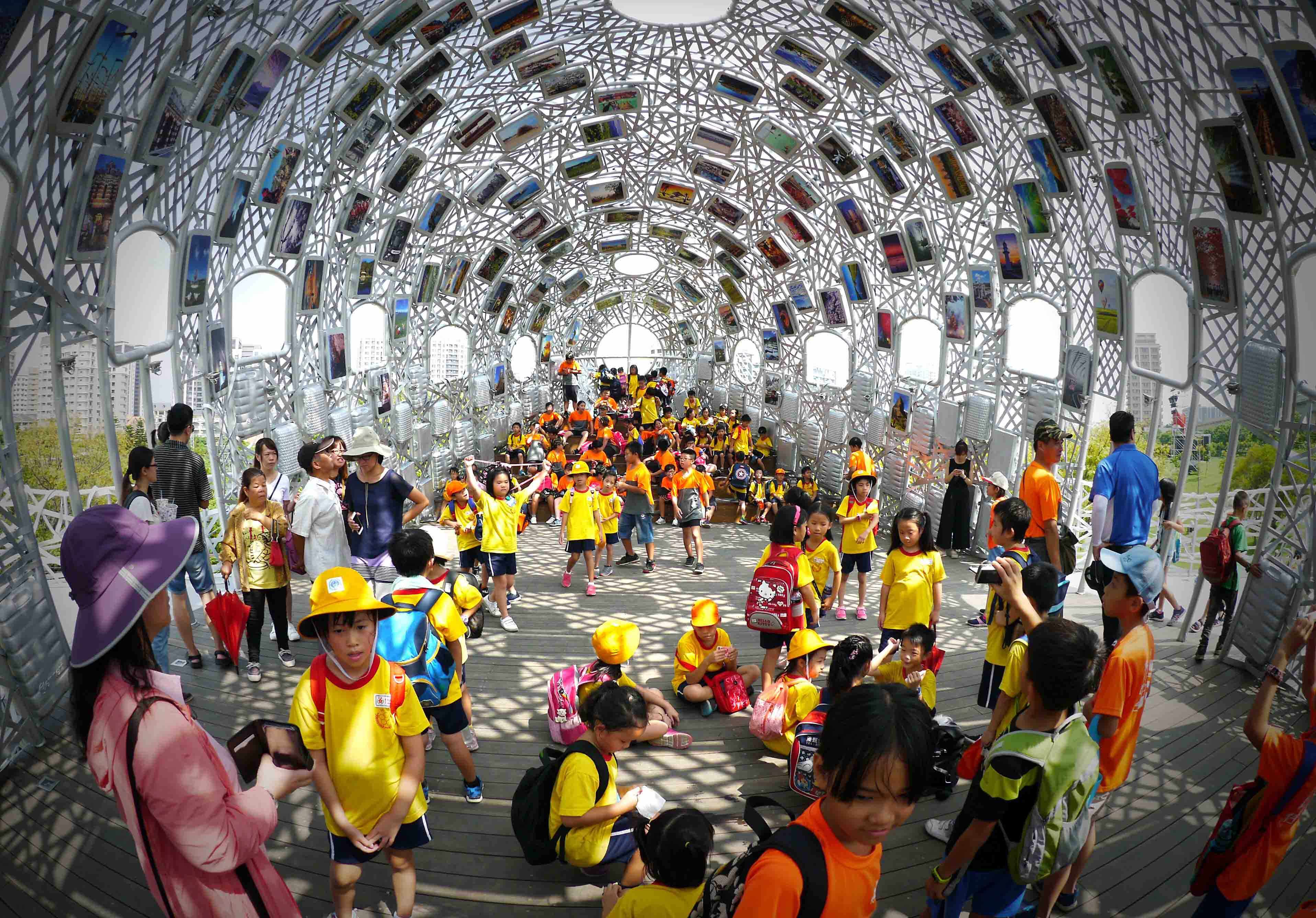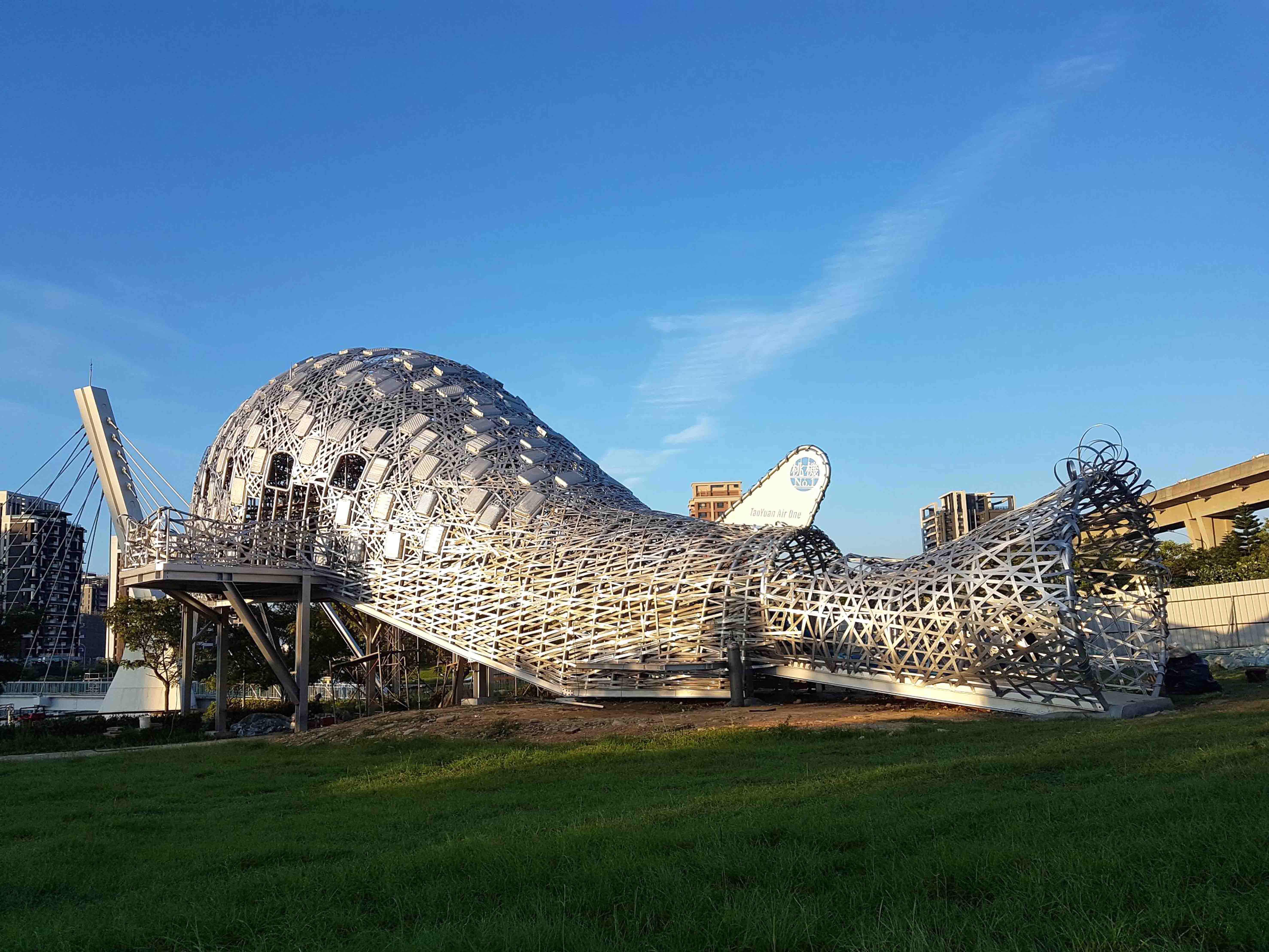 以鋼骨建構桃園特有的飛機外貌,鑲入幾百個銀色旅行箱造型,加上金屬編織手法,代表著旅人的各式夢想故事。每次的出發及返家,旅行箱磨退亮麗外表,滿載所有美麗的回憶。鋼骨框起這些凝視過程的旅行箱,形成蘊含記憶的大載體。乘載心靈點滴的旅行箱,圍成巨大的機體。走入其間短暫隔絕繁華紅塵,欣賞壁面桃園美麗風景圖像。 登上這座”桃機一號”專機,與地面、空中的陽光、鳥兒及人們相遇,享受每一次凝視的片刻喜悅!