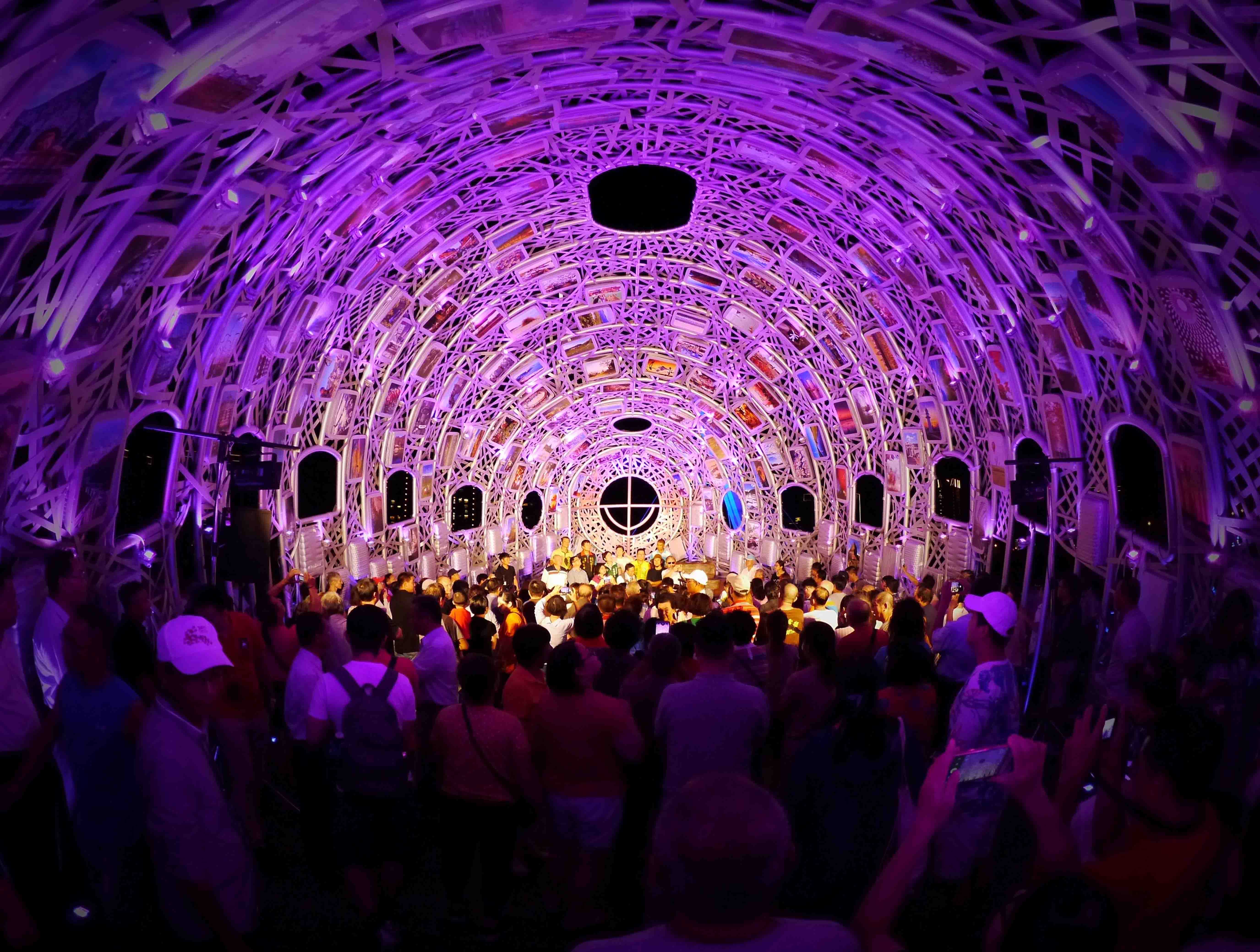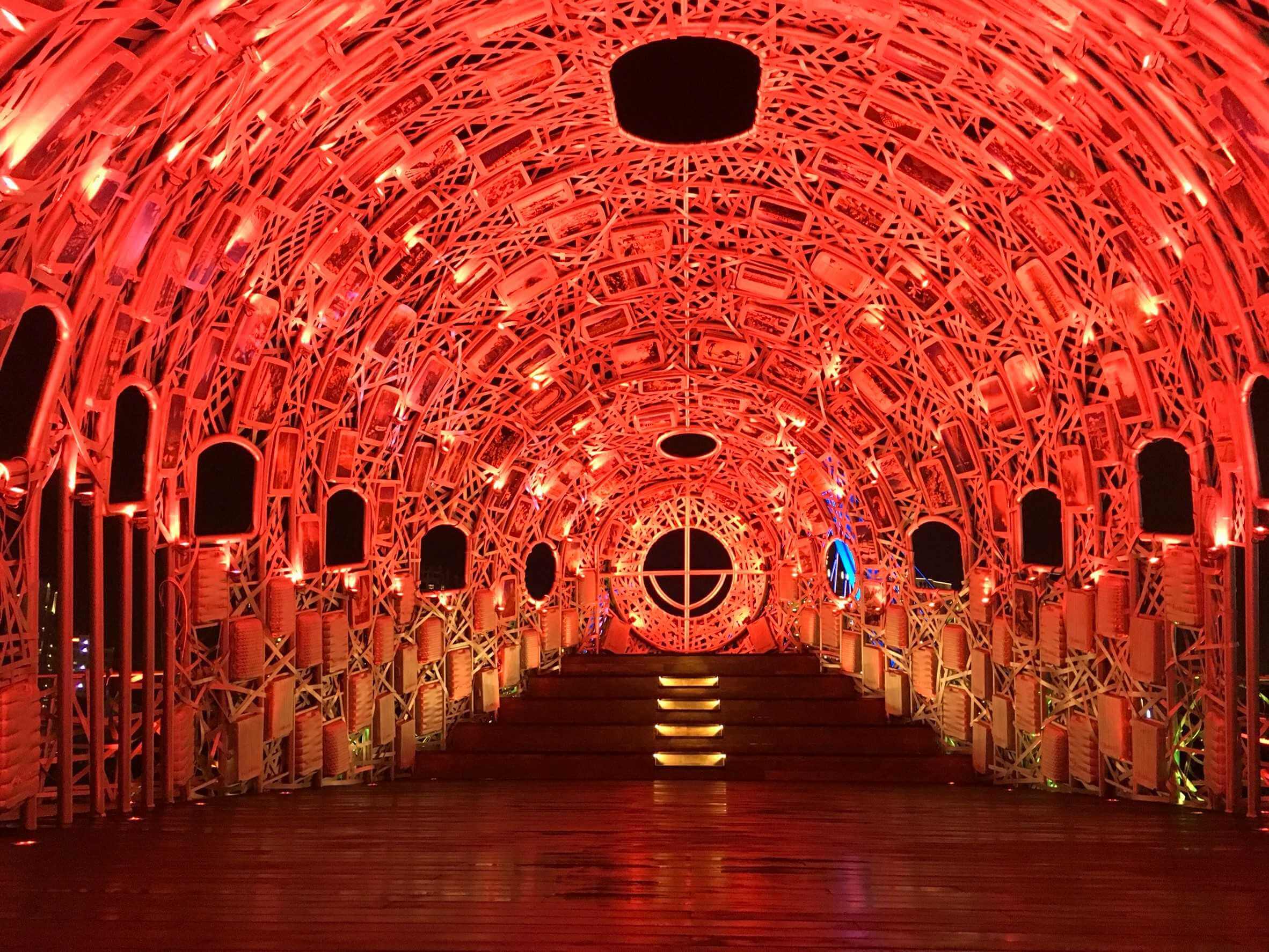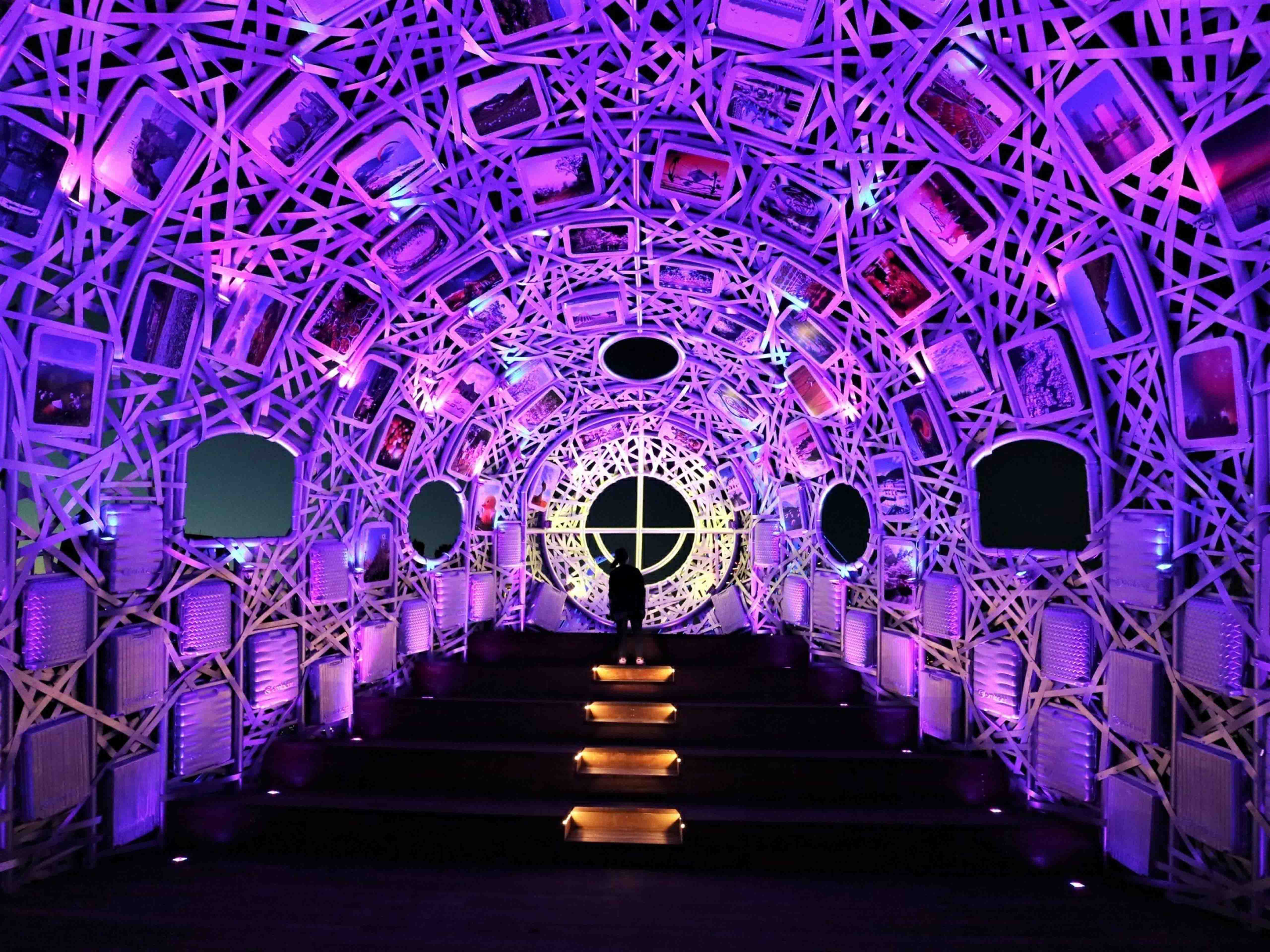 以鋼骨建構桃園特有的飛機外貌,鑲入幾百個銀色旅行箱造型,加上金屬編織手法,代表著旅人的各式夢想故事。每次的出發及返家,旅行箱磨退亮麗外表,滿載所有美麗的回憶。鋼骨框起這些凝視過程的旅行箱,形成蘊含記憶的大載體。乘載心靈點滴的旅行箱,圍成巨大的機體。走入其間短暫隔絕繁華紅塵,欣賞壁面桃園美麗風景圖像。 登上這座”桃機一號”專機,與地面、空中的陽光、鳥兒及人們相遇,享受每一次凝視的片刻喜悅!