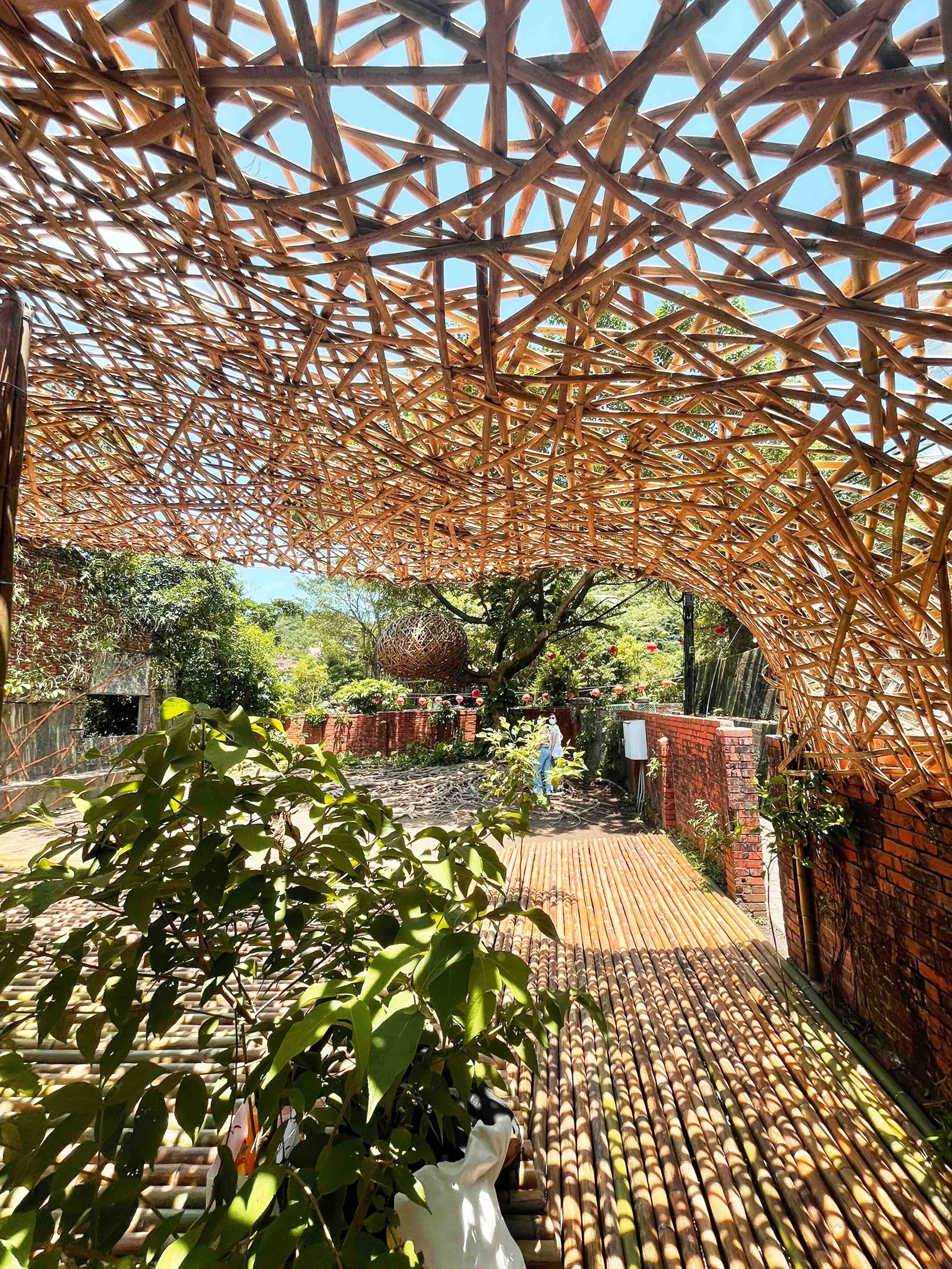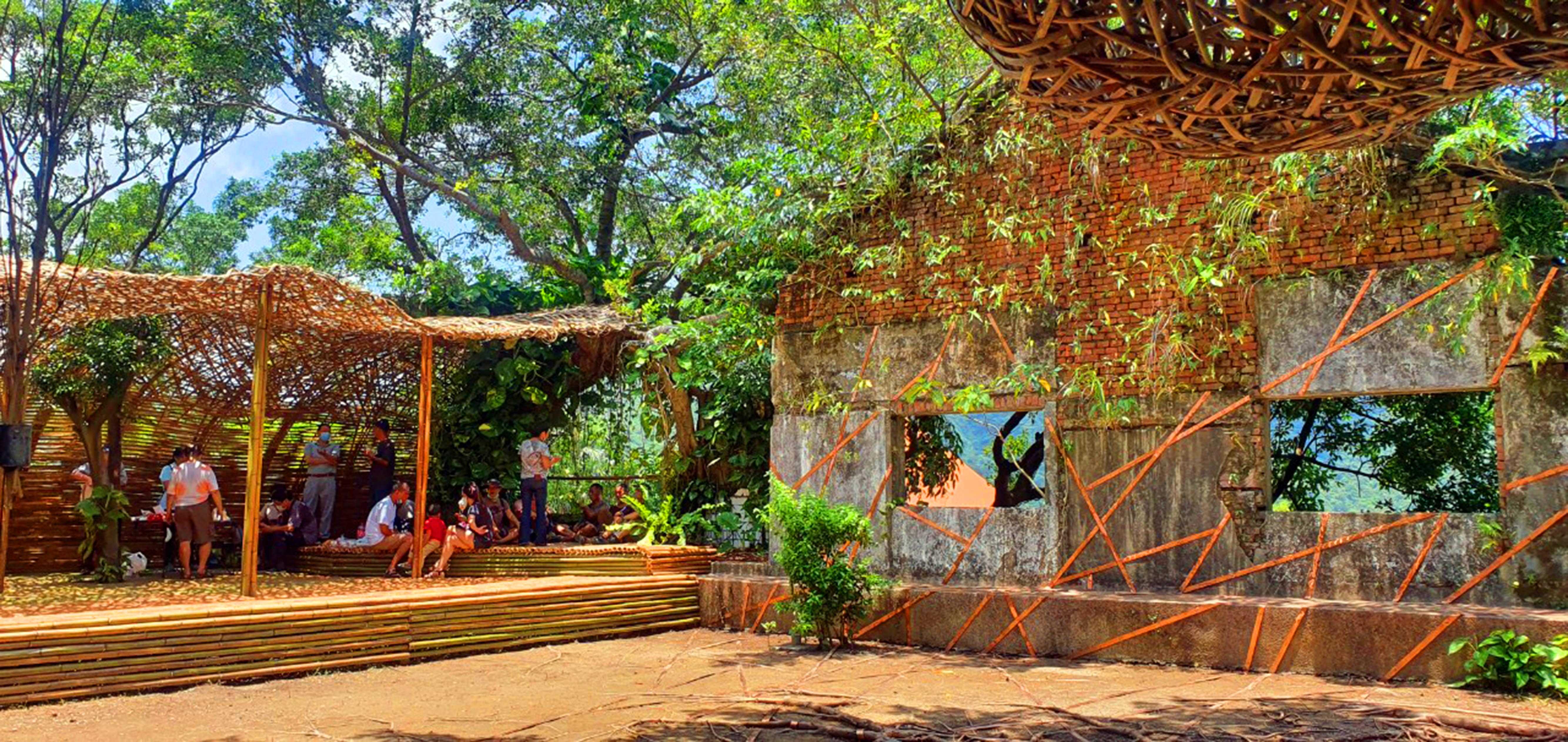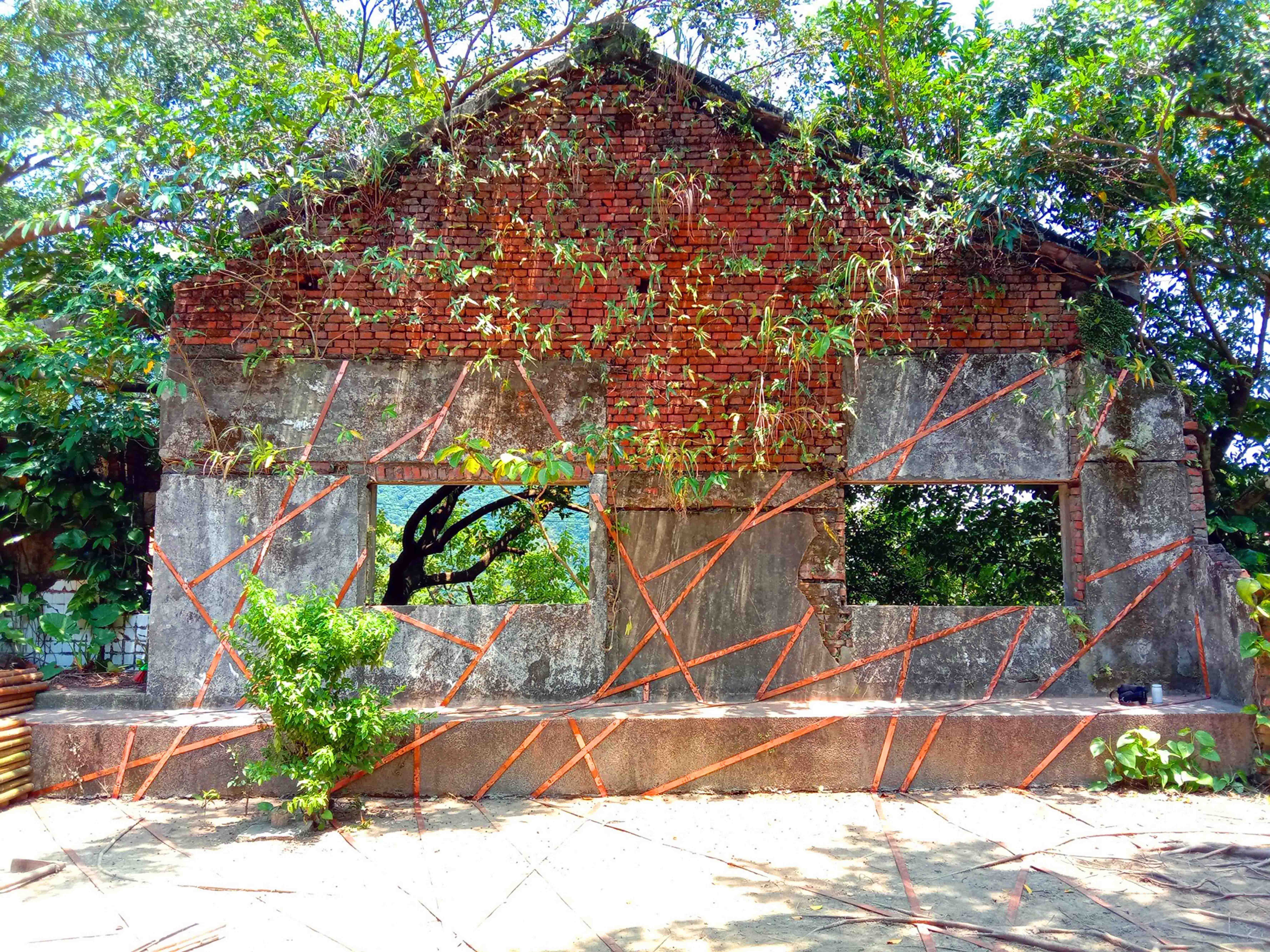 運用金色的銅片編織,藤蔓般攀附在舊宿舍群唯一存留的牆面。金色蔓條的移動路線,記錄著當代歲月的豐富紋理。在這些新註的深刻紋路下,仍能看見往日時光的微弱痕跡。庭院上的大樹,恰似代表存在的「生命之樹」,連接土地的生命源頭守護。將其樹根清理顯露出來,讓盤據根固大地的永恆存續精神散落開來。