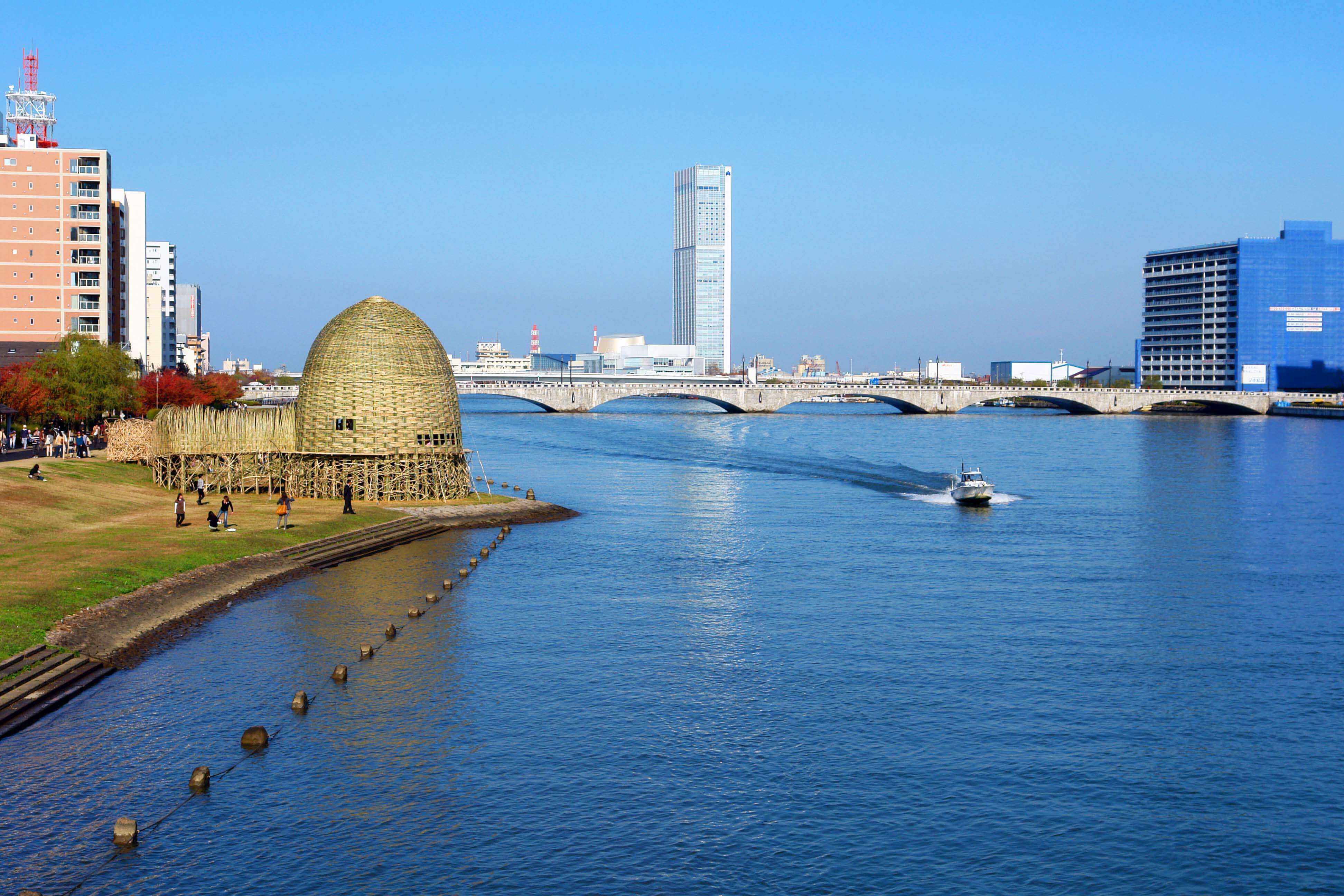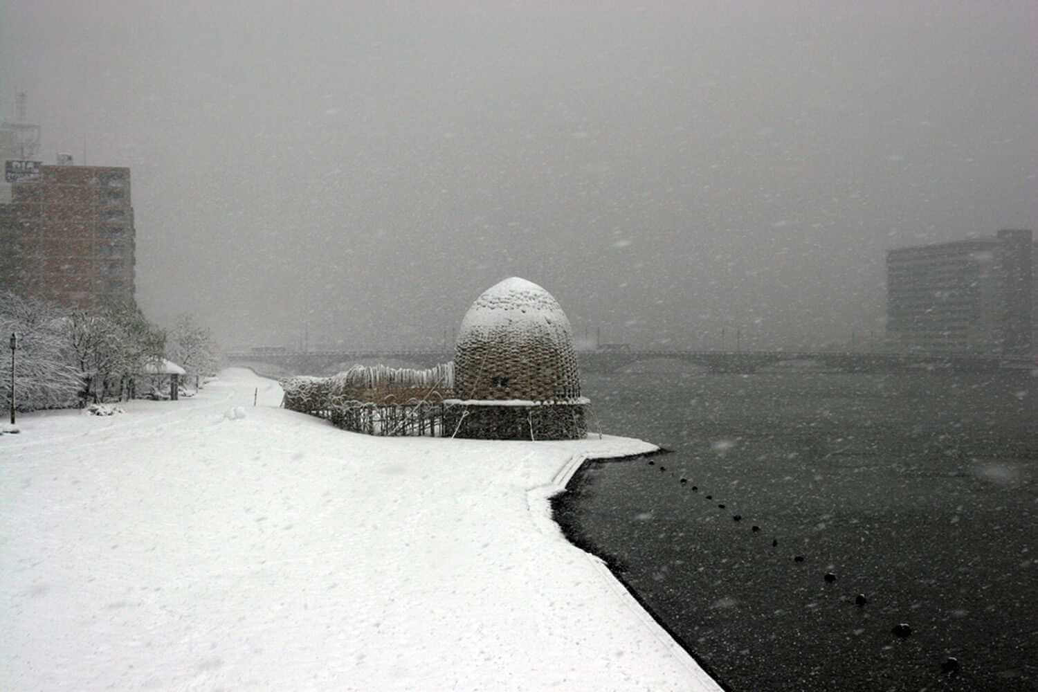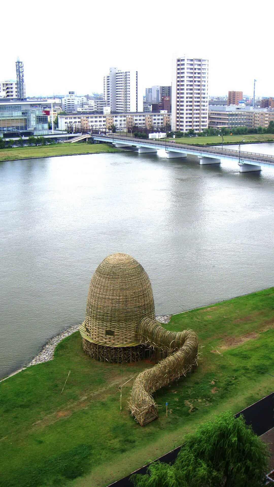 萬代橋在新潟大地震中,為唯一屹立不搖的建物,被視為新潟的精神支柱,後來一度毀於海嘯,後又重建。「在水一方」以竹子的韌性呈現巨大的空間容器,呈現如母親子宮般的心靈沉澱的居所。在這個空間量體中,以竹縫空間的通透性可以看見現代化的都市建築和河景,也可以在此得到心暫時的沉澱,撫慰了曾受新潟大地震之害的人們,艱苦重建的心靈。